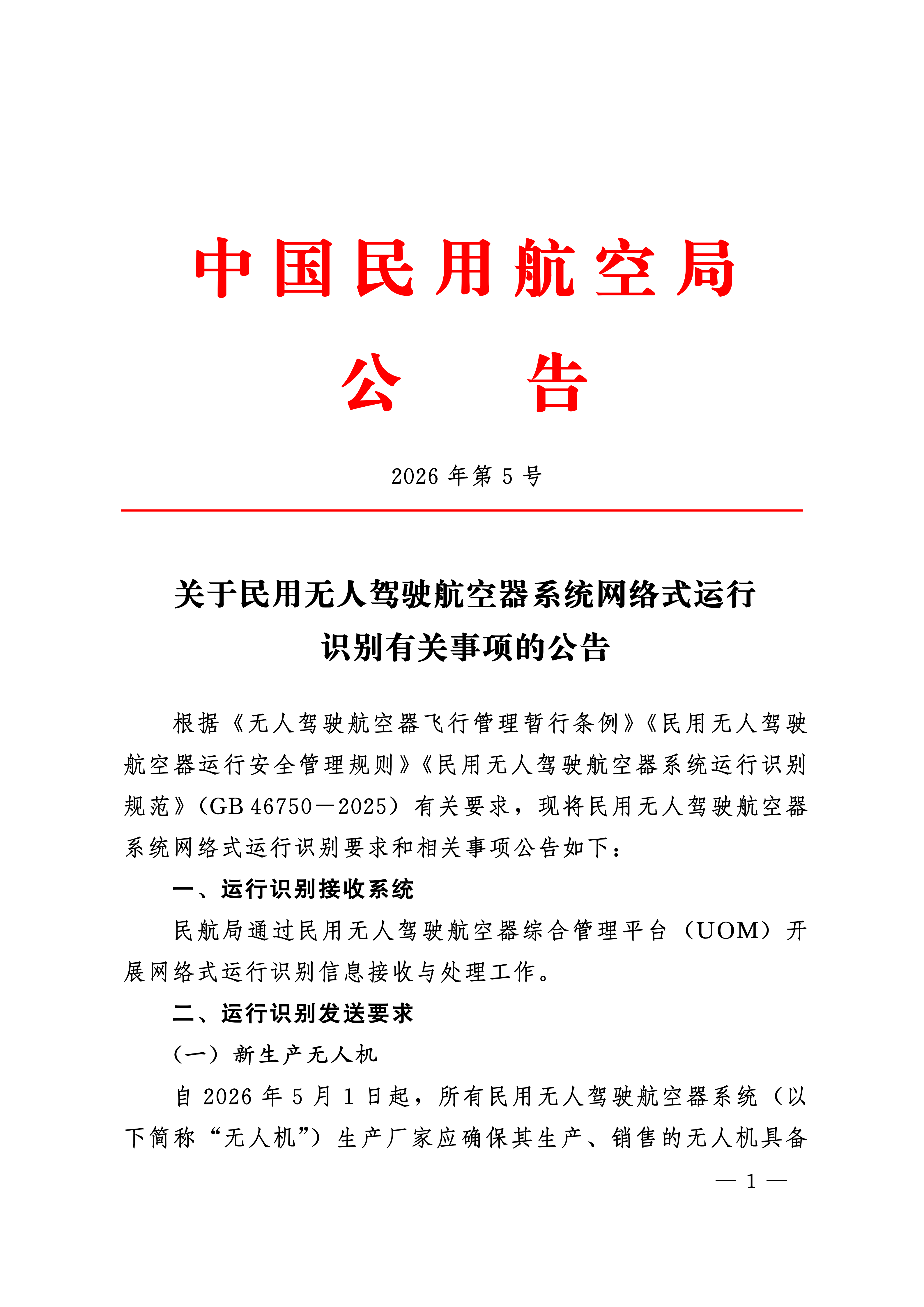 > 《关于民用无人驾驶航空器系统网络式运行识别有关事项的公告》(民航局公告 2026 年第 5 号)